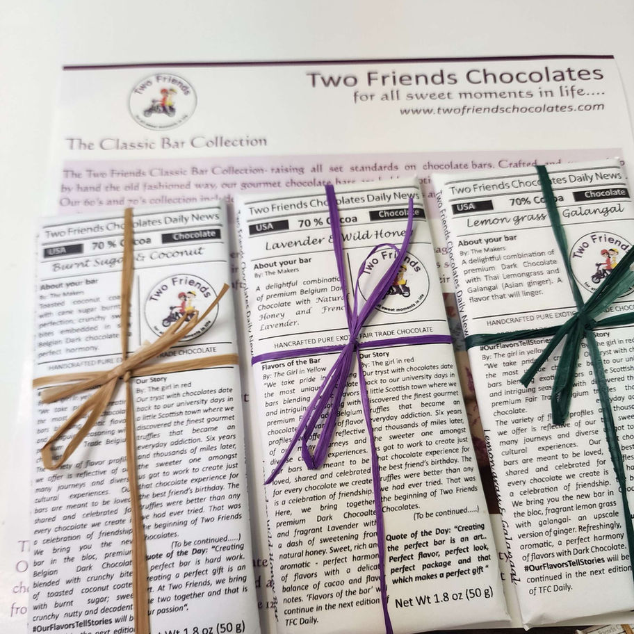 Choose any of your favorite three flavors from our handcrafted chocolate bars collection to make a special treat of perfect gift.